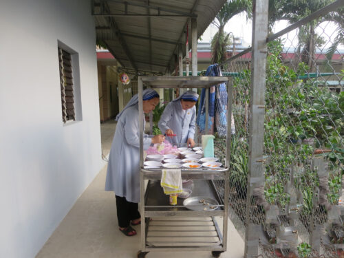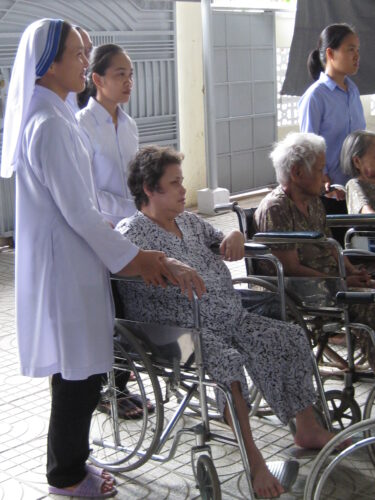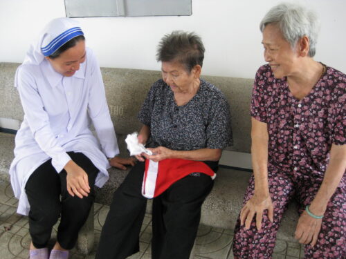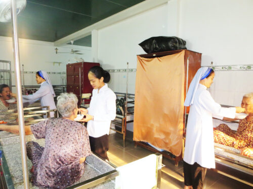 Hiện nay Nhà Tình Thương có trên 70 bà, các bà là những người không có con cháu, neo đơn và không có một mái nhà. Có người các Soeurs đón từ ngoài chợ hoặc gầm cầu… Hiện nay có gần 40 bà nằm liệt tại giường. Các bà tuổi từ 75 đến 104 tuổi, các bà còn lại cũng yếu đau. Các Soeurs chăm sóc tận tình cho đến cái chết bình an.